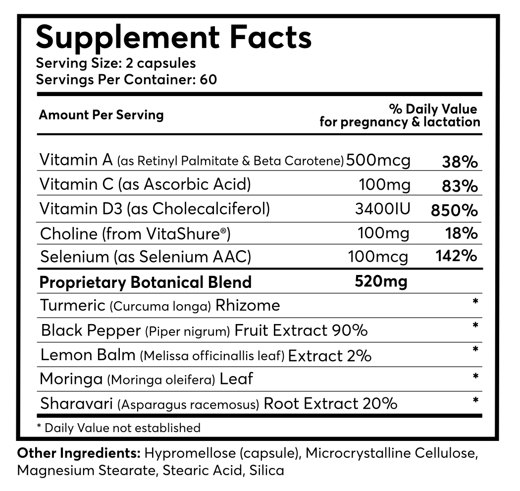 Therapeutic, bioactive vitamins A, C, D3, choline & selenium restore depleted stores and nourish mom + baby—all in two daily capsules.Botanicals for Recovery